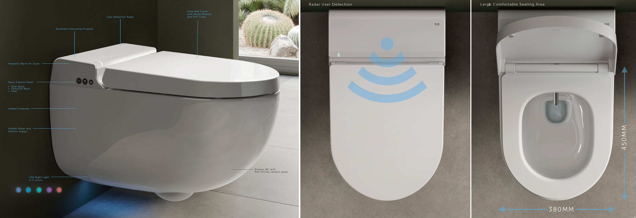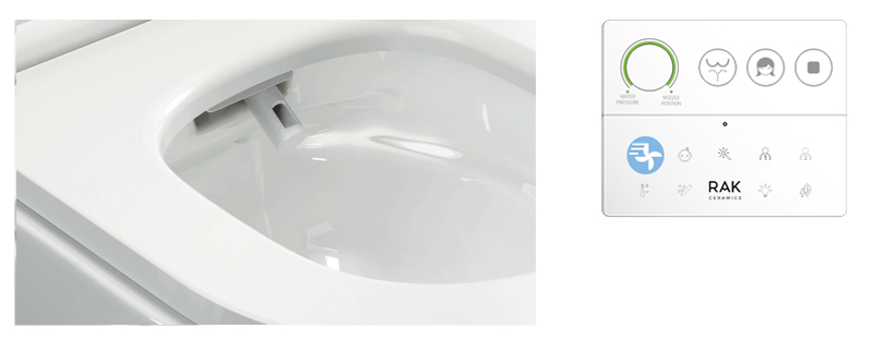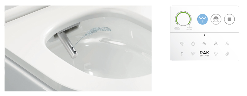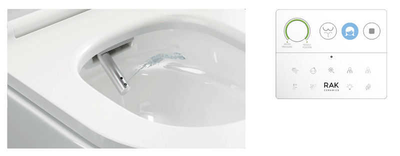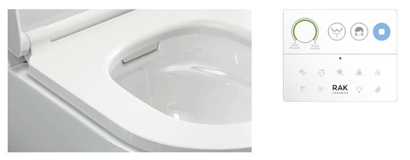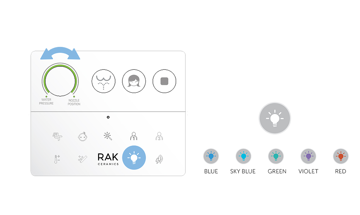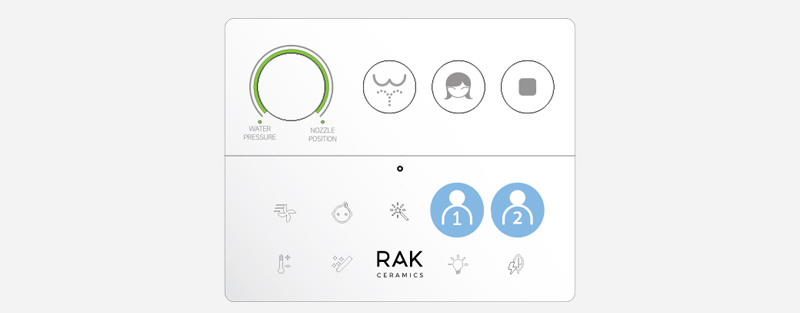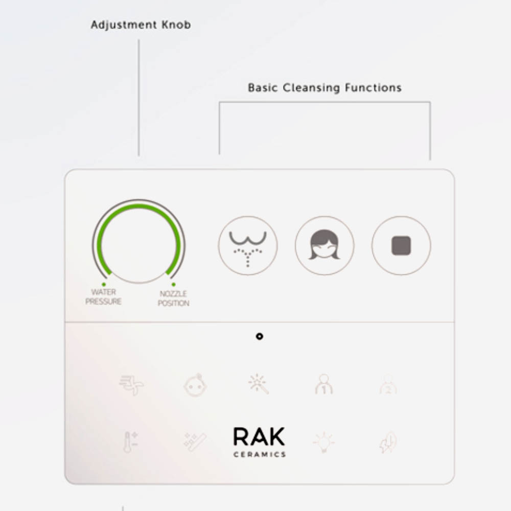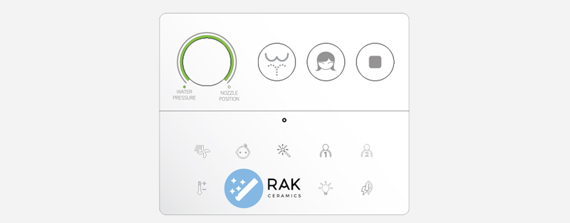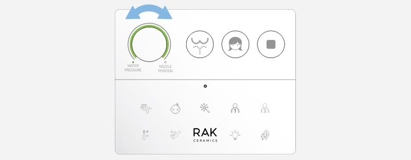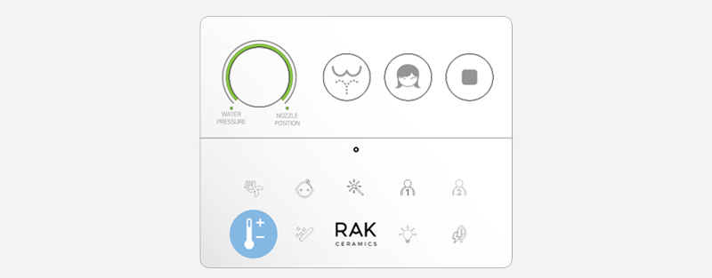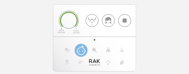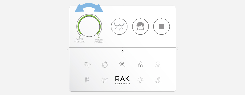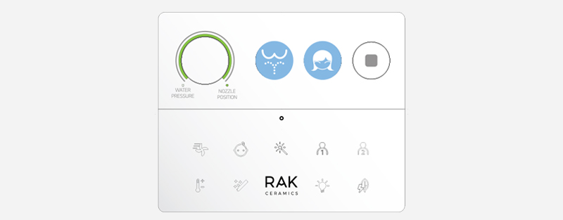 Pilot RAK-Cleon zapewnia pełną kontrolę na wyciągnięcie ręki, łatwo i intuicyjnie. Trzy główne przyciski aktywują główne funkcje oczyszczania, a pokrętło regulacji pozwala użytkownikowi wybrać preferowane ciśnienie wody i pozycję dyszy. Wszystkie pozostałe funkcje oczyszczania pojawiają się tylko po dotknięciu logo RAK Ceramics, co pozwala na bardziej zaawansowane doznania.
