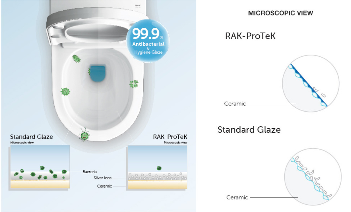 RAK-PROTEK to innowacyjna powłoka ceramiczna opracowana w celu ochrony umywalek, toalet i pisuarów, aby uczynić je bardziej higienicznymi i łatwiejszymi w czyszczeniu. RAK-PROTEK, jest wypalany razem z ceramiką, co, zapewnia gładszą powierzchnię, w