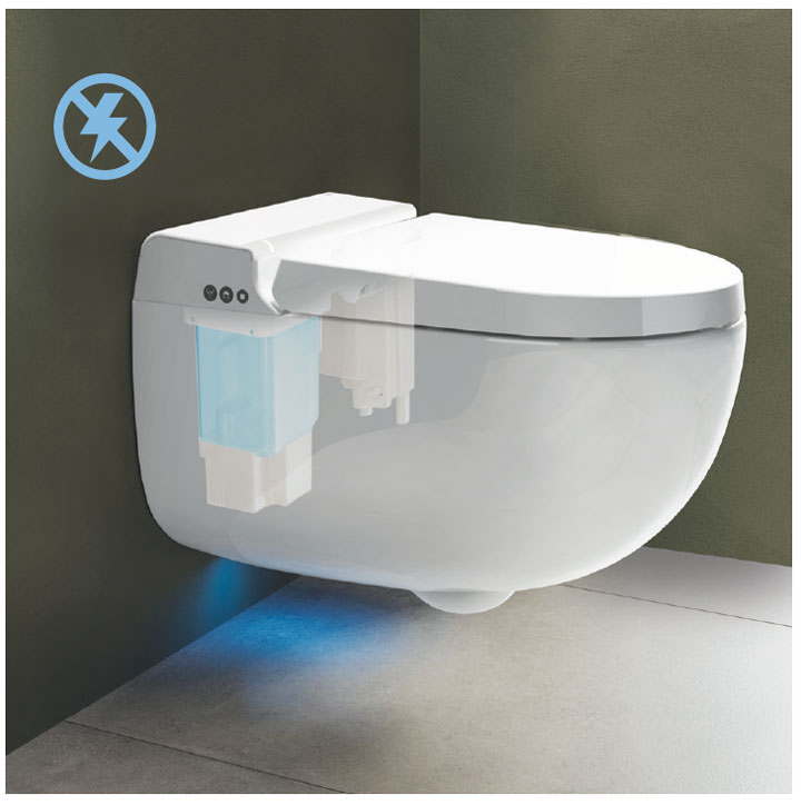 W przypadku braku zasilania lub awarii systemu i wynikającej z tego konieczności skorzystania z pomocy RAK Ceramics, produkt może być nadal używany. Podstawowe funkcje toalety RAK-Cleon nie są ograniczone: spłukiwanie, siedzenie, wolnoopadająca deska i pokrywa oraz łatwe wypinanie.