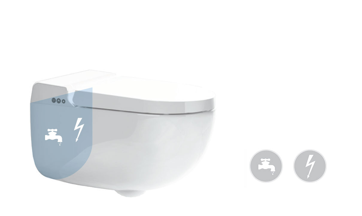 Zewnętrzne przyłącza wodne i elektryczne są ukryte za misą; na zamontowanym produkcie nie widać żadnych kabli ani elastycznych węży.